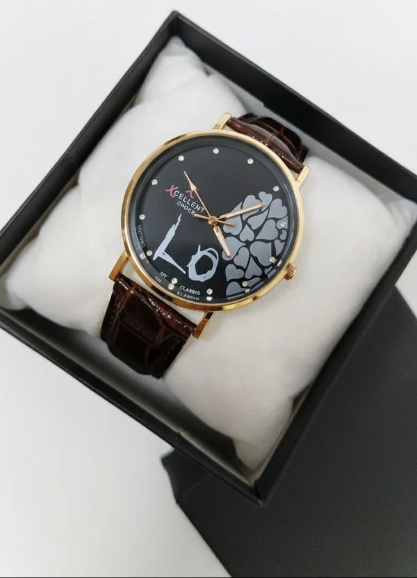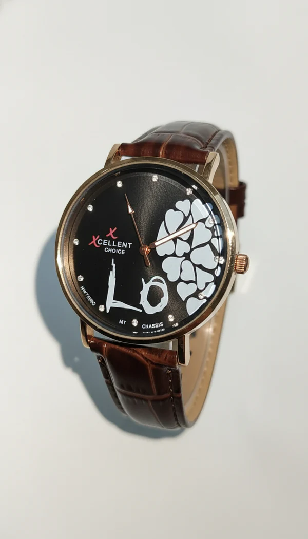 Elegant black dial watch with gold-tone case and brown leather strap. Features sparkling hour markers and artistic heart design. Lightweight, stylish, and perfect for casual, formal, and gifting occasions.https://purepick.pk
