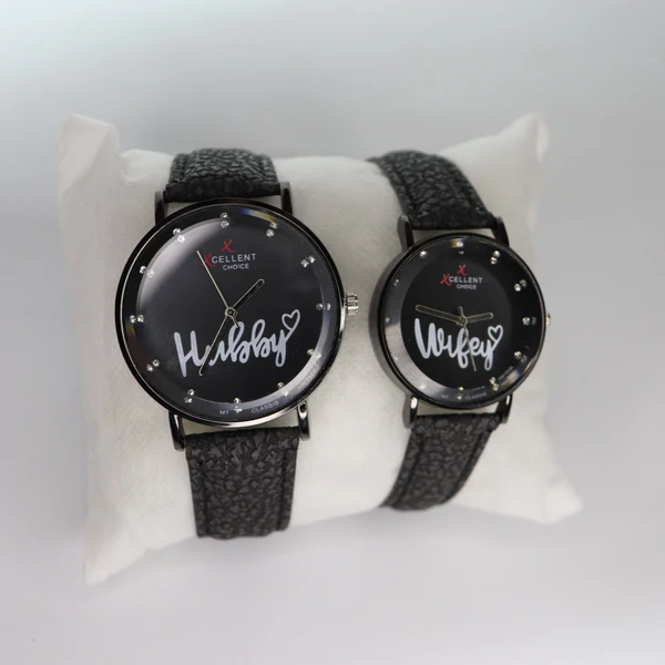 Designed in a sophisticated all-black aesthetic, this matching timepiece set embodies modern luxury. The deep black dial creates a bold yet minimalist statement, enhanced with delicately set crystal hour markers that reflect light with subtle brilliance. The graceful script “Husband” and “Wifey” is thoughtfully placed on each dial — not overpowering, but powerful enough to symbolize commitment and pride.