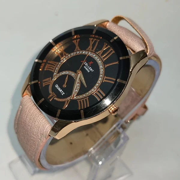 Add elegance to your everyday style with the Xcellent Choice Women’s Analog Quartz Watch. Featuring a stunning black dial with rose-gold Roman numeral markers and a crystal-studded inner circle, this watch blends classic charm with modern luxury. The soft pink textured leather strap provides comfort and a fashionable look, making it perfect for casual outings, office wear, and special occasions.