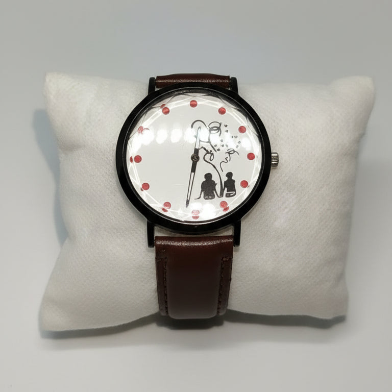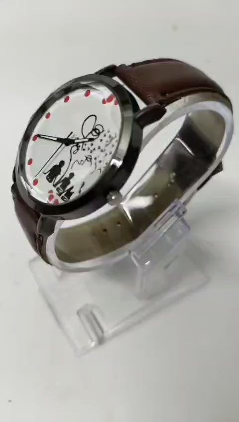 This charming analog wristwatch combines simplicity and romance in a beautifully artistic design. The watch features a white dial adorned with red polka dots and a cute silhouette illustration of a couple, making it a perfect accessory for those who appreciate sentimental, expressive styles.